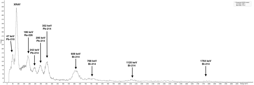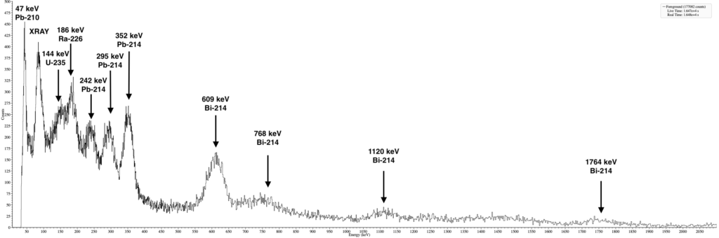 For comparison, here is a spectrum of pure Ra-226 from an old radium painted watch. While similar, the U235 peak at 144keV is missing which is distinctive feature between natural uranium and radium spectra.